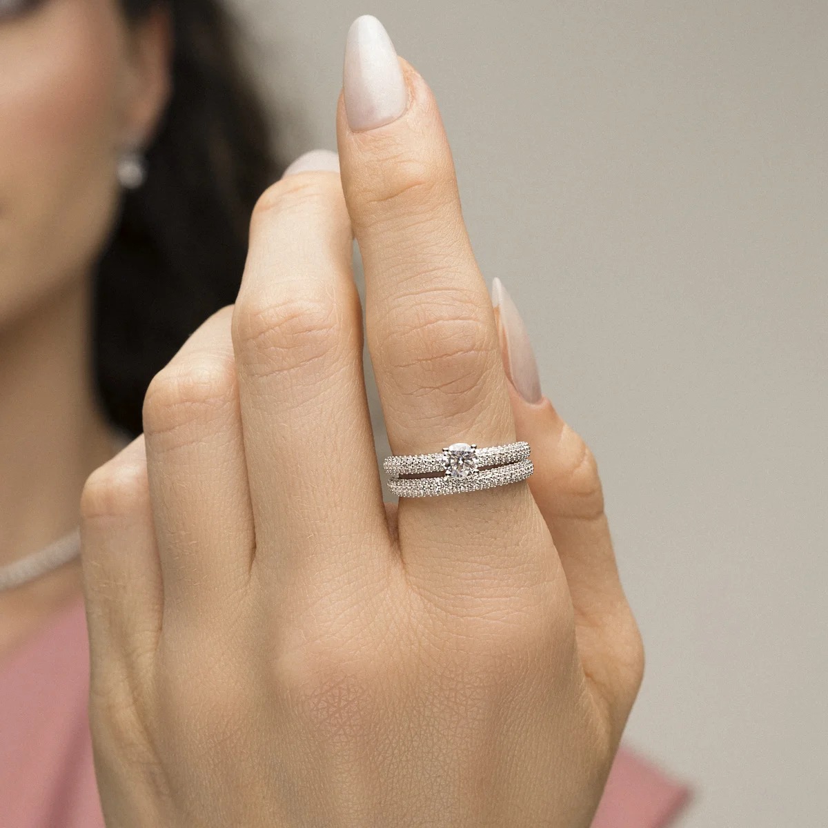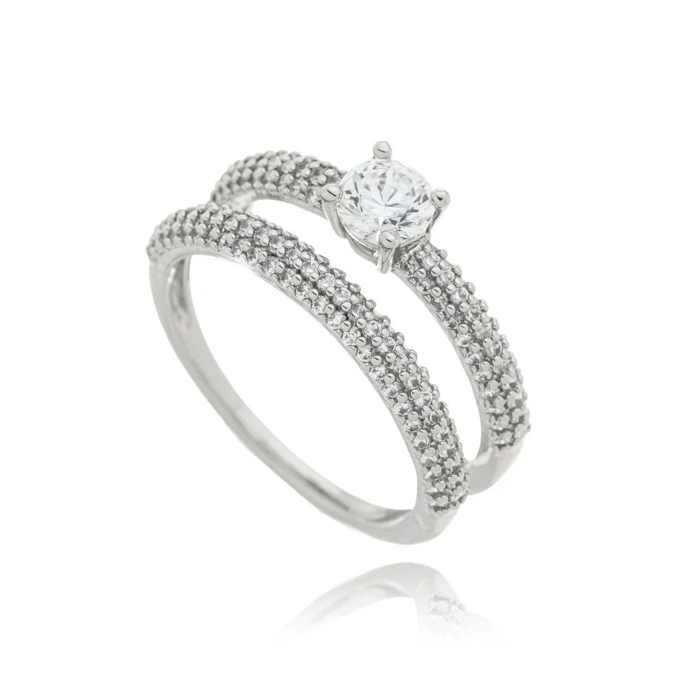 Anel Solitário + Aparador Cravejado Zircônia e Microzircônia Ródio Branco nº18