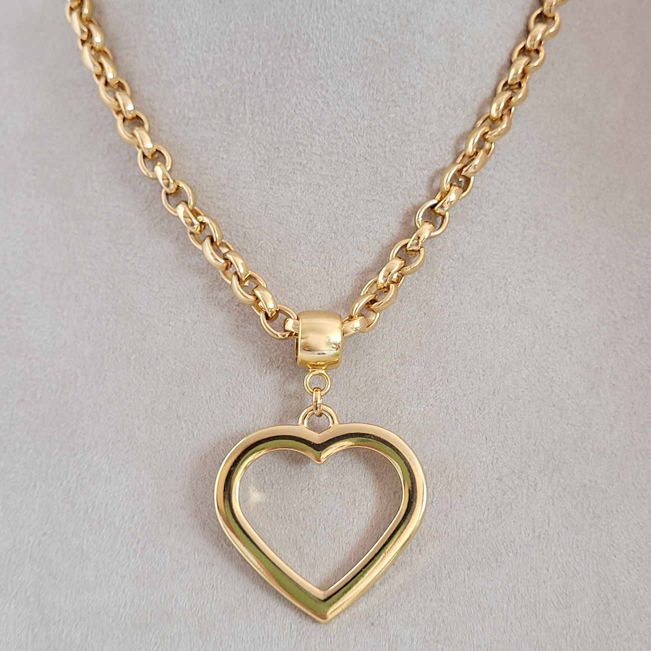 Colar Elo Português Com Pingente Coração Vazado Verniz Italiano 45cm + Extensor