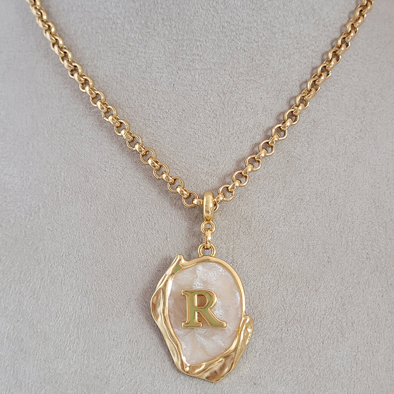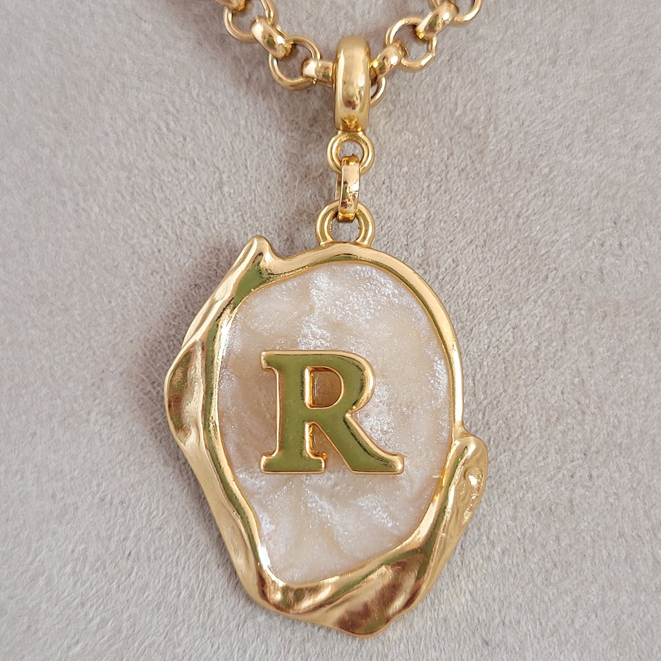 Colar Elo Português Com Pingente Madre Pérola Letra R Verniz Italiano 45cm + Extensor