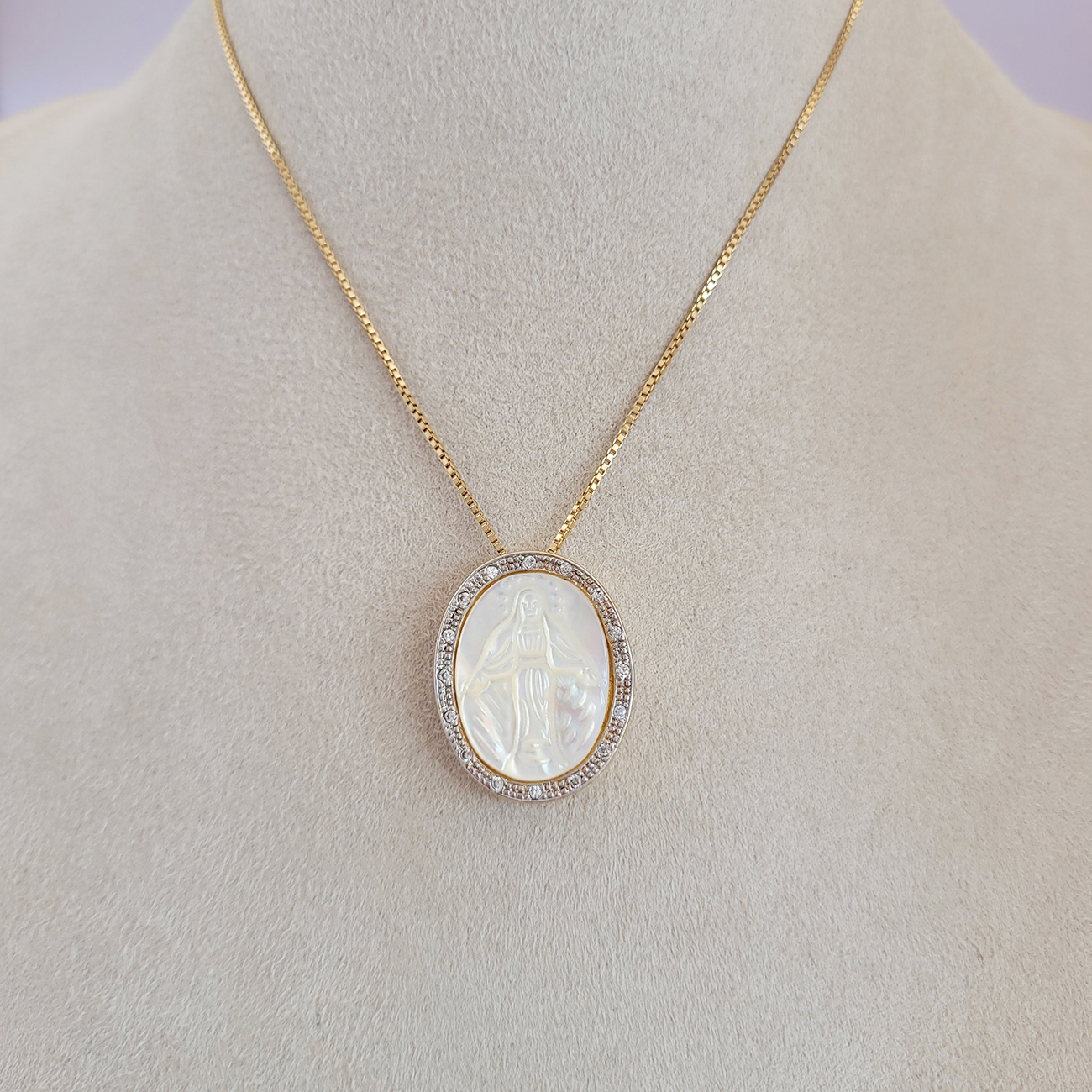 Colar Elo Veneziana Com Pingente Nossa Senhora Das Graças De Madre Pérola Cravejado De Microzircônias 40cm + Extensor