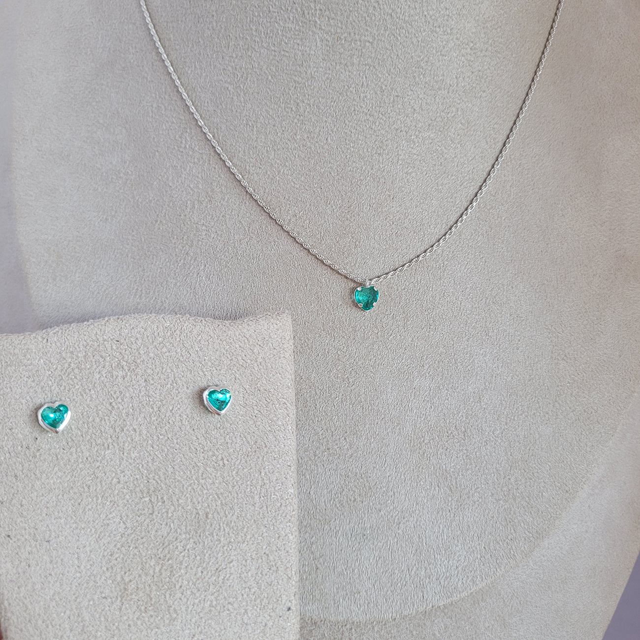 1 x Corrente / Colar Cordão Baiano Com Pingente Coração Verde Prata 2mm 45cm1 x Brinco Coração Verde Prata