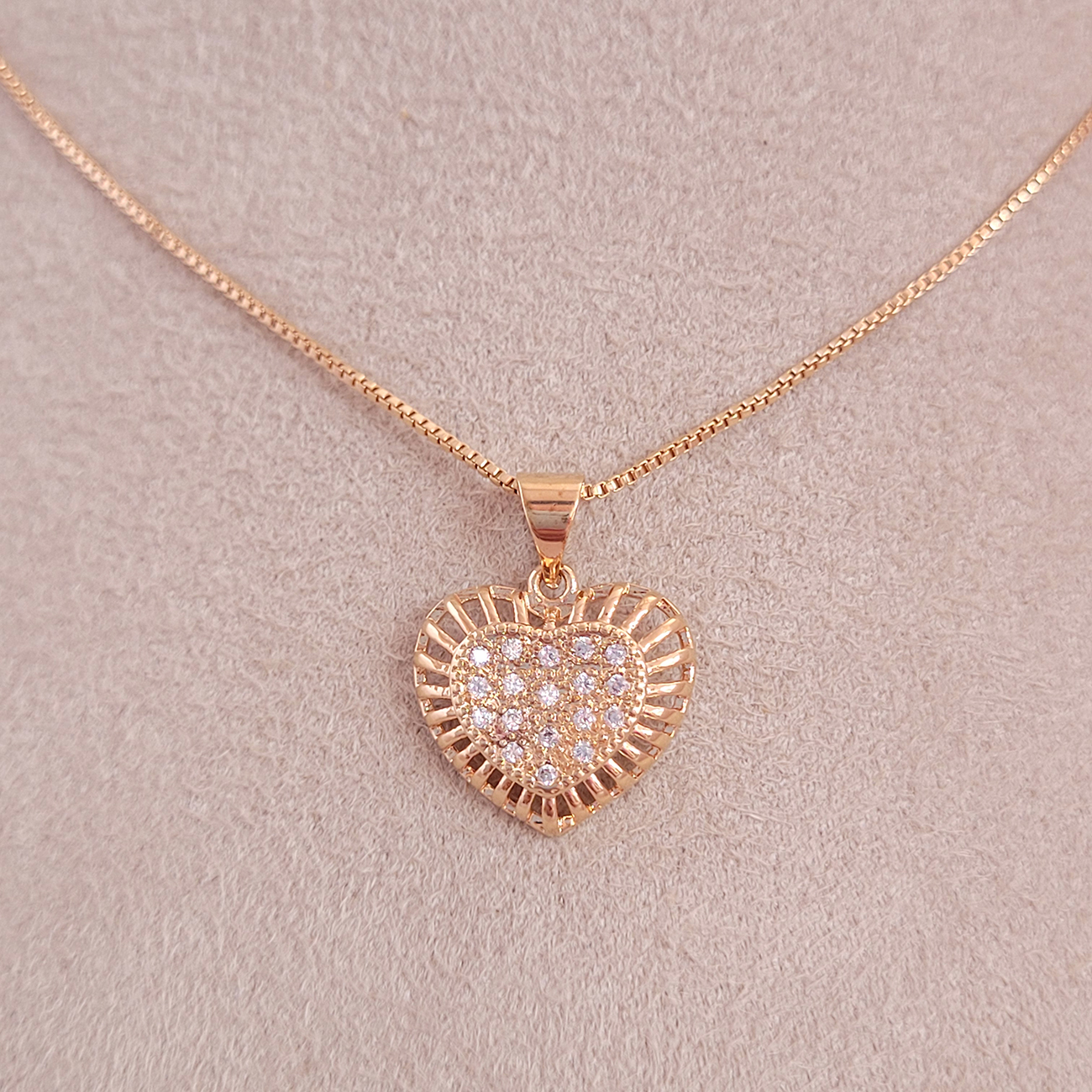 Conjunto Elo Veneziana Coração Cravejado Microzircônia Folheado Ouro Rose 45cm + Extensor