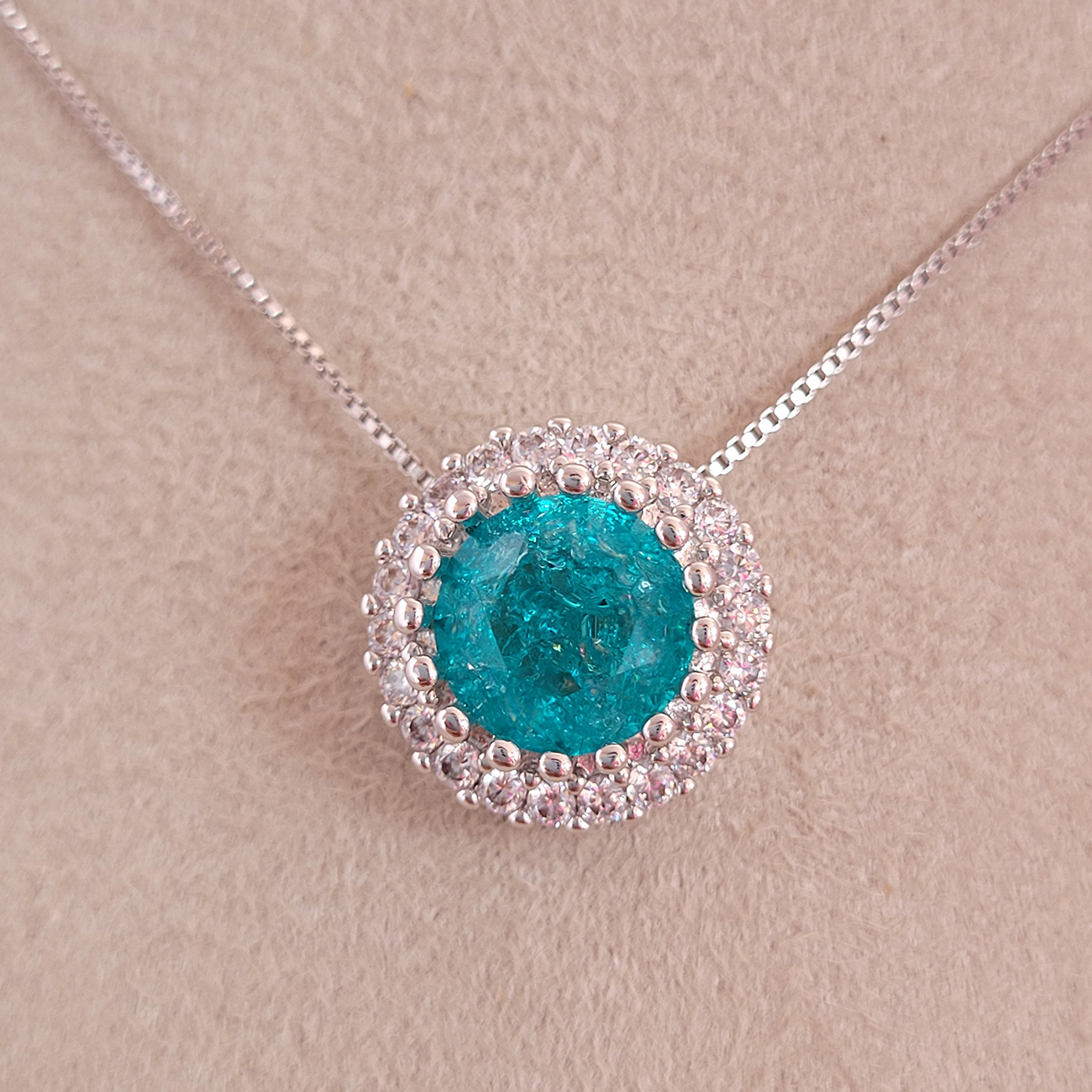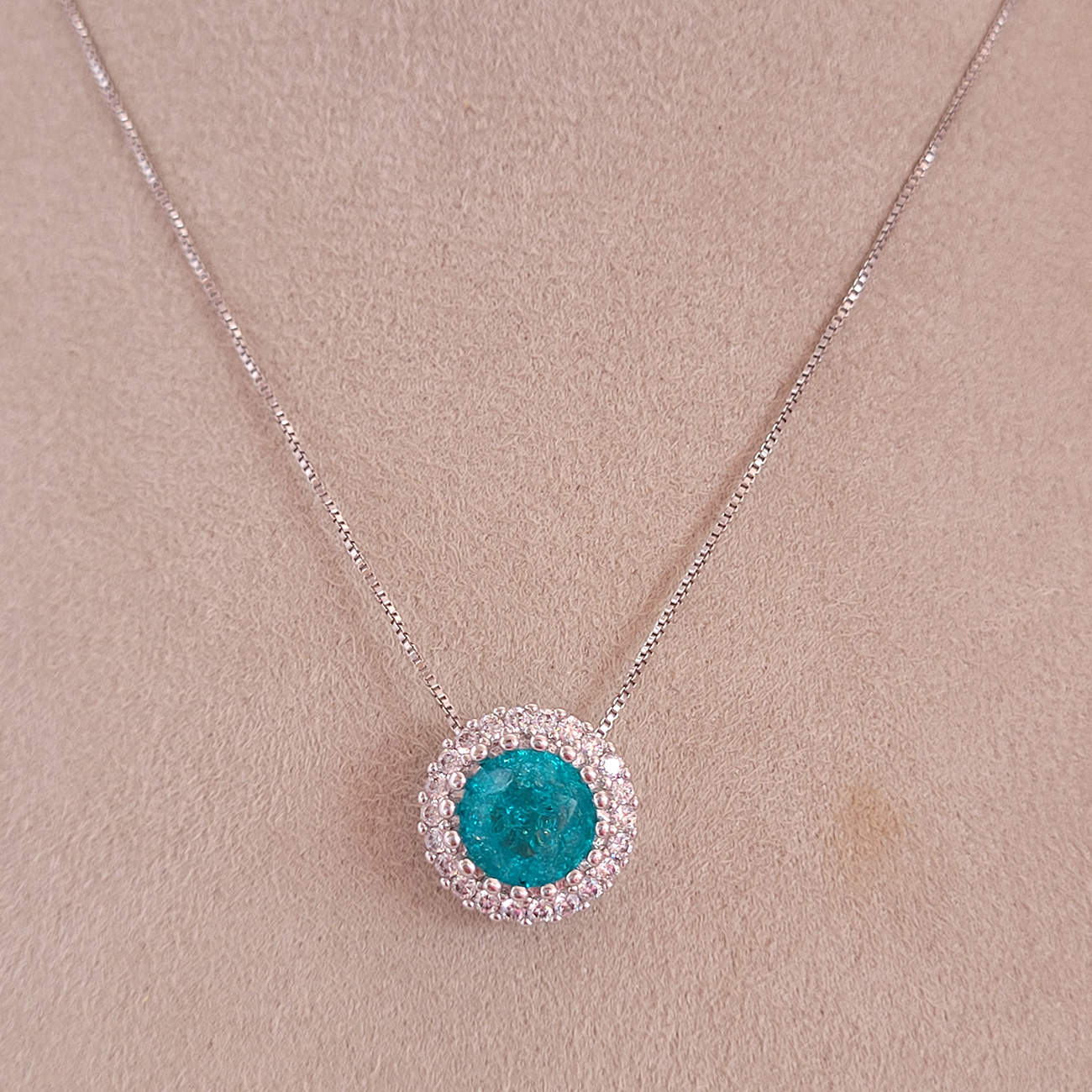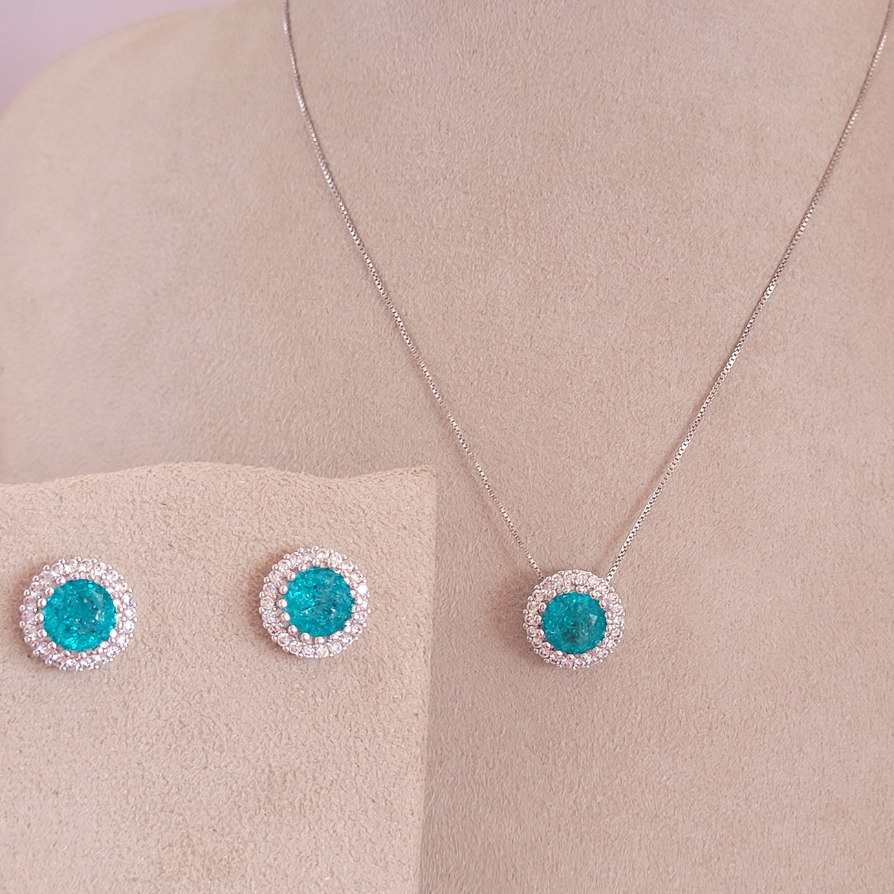 Conjunto Elo Veneziana Pedra Natural Azul Tiffany Cravejado Zircônia Ródio Branco 45cm + Extensor