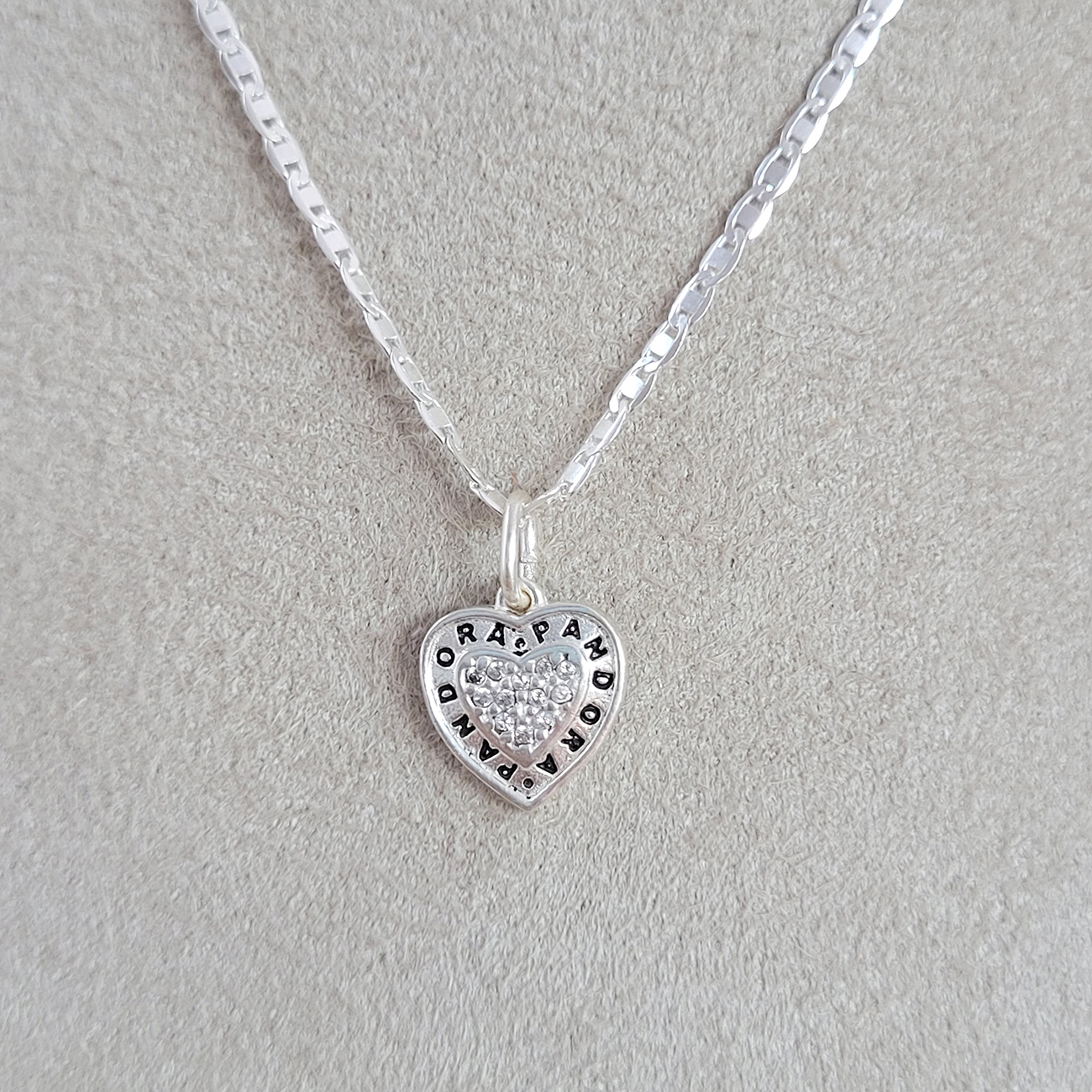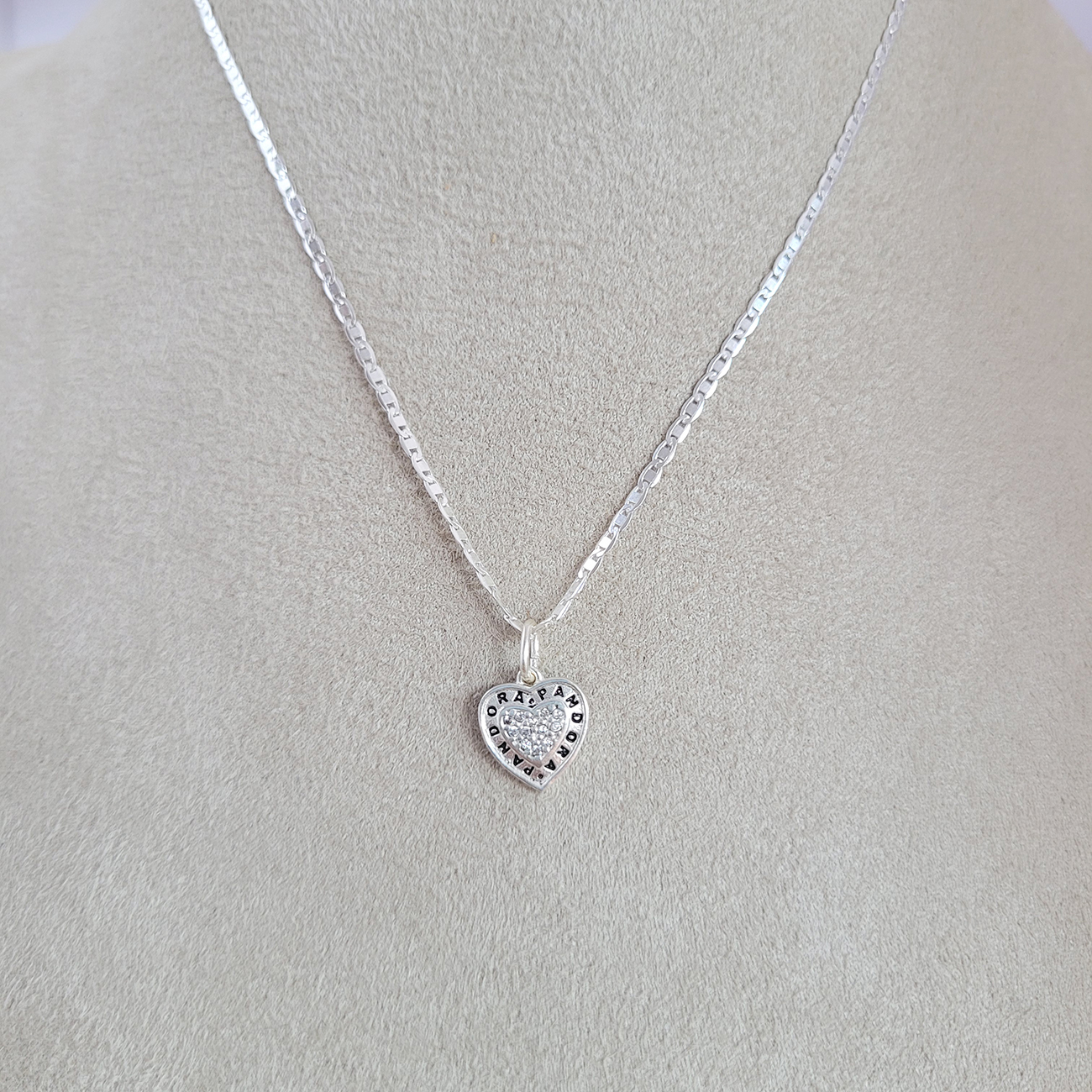 Corrente / Colar Elo Piastrine Com Pingente Coração Pandora Prata 3mm 40cm