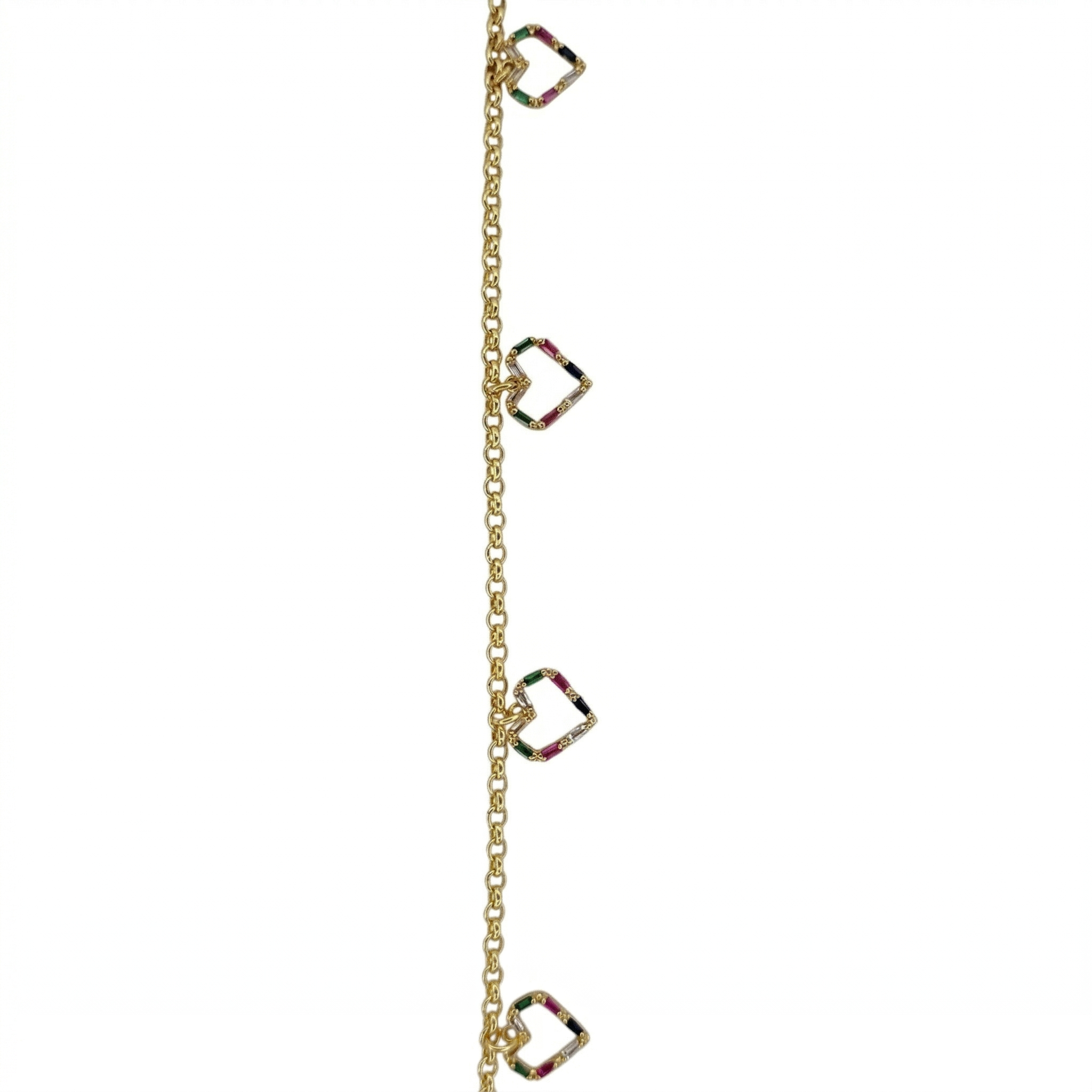 Pulseira Elo Português Com Corações Cravejada Zircônia Navete Colorida Folheada A Ouro 18cm + Extensor