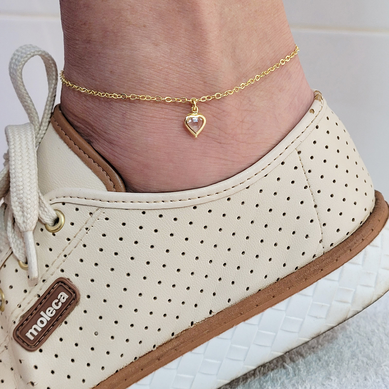 Tornozeleira Elo Oval Coração Ponto de Luz Cristal Folheada A Ouro 22cm + Extensor
