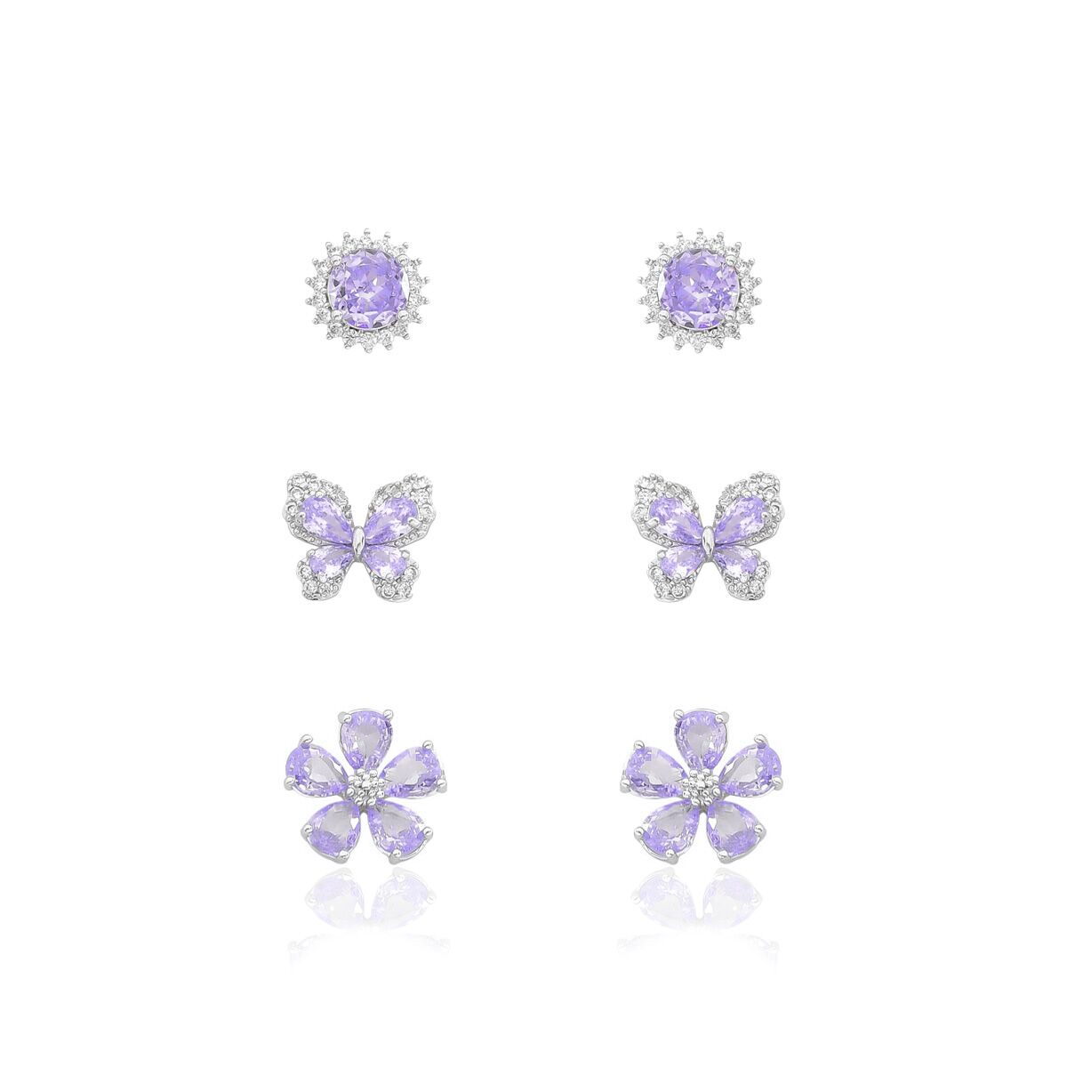 Trio Brinco Mix Borboleta Cravejado Microzircônia e Navete Lavanda Ródio Branco